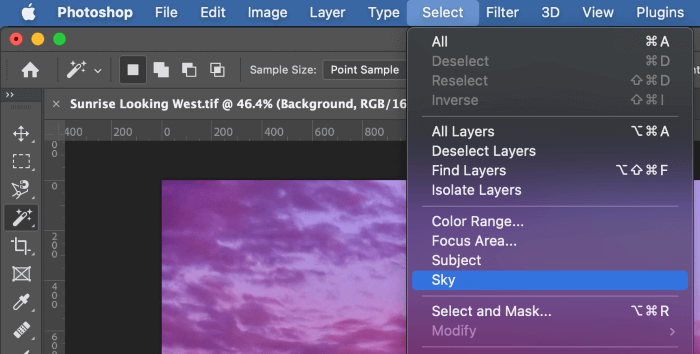 Recent versions of Photoshop have begun including some impressive new automatic selection features with very specific usages. Located in the Select menu, you’ll find four very specific options: Color Range, Focal Area, Subject, and Sky.