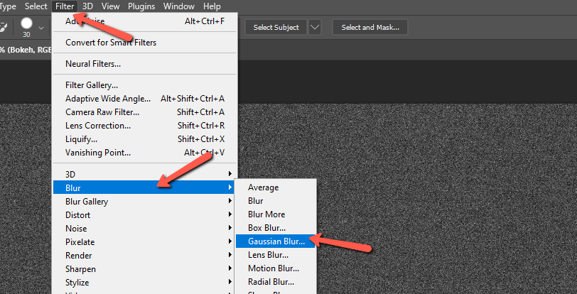 Now we want to blur this noise so go back up to Filter, hover over Blur, and choose Gaussian Blur.