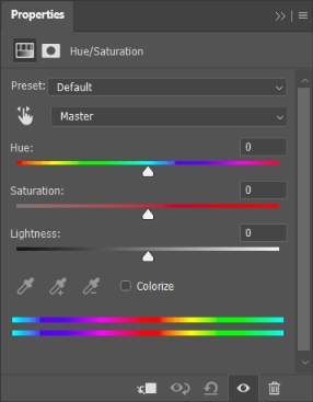 The Hue/Saturation layer will appear on top of your base layer in the Layers panel. The Hue/Saturation properties flyout also appears with its various options.