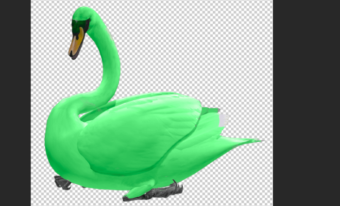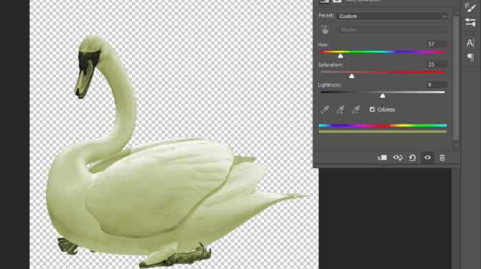 You might notice that the Hue/Saturation slider doesn’t do much if your PNG is white. Check out this white swan. I’ve slid the hue slider down into the greens and upped the saturation, but nothing much has happened. It just looks weird.