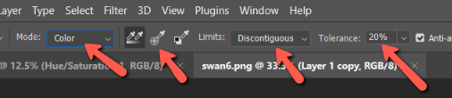 For the limits, you can choose contiguous in which the pixels must be touching to be affected. Discontiguous changes any pixel anywhere in the image that is the same as the sampled color. We’ll choose that.
