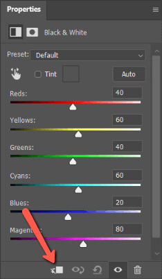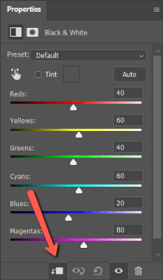 For example, here’s a Black and White Adjustment layer panel. The default is for the clipping mask icon to be inactive which is indicated by the arrow being crossed out.