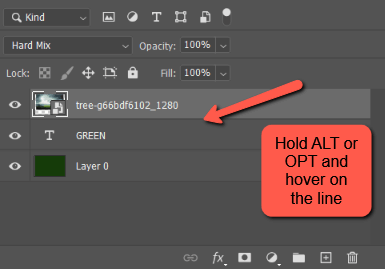 Another alternative is to hold down the Alt or Option key and hover the mouse over the line between the layers you want to connect. The cursor will turn into a little box with the 90-degree arrow pointing down. Left-click to apply the mask.