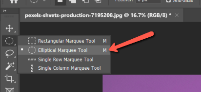 For example, I’m going to grab the Elliptical Marquee Tool. It might be hiding under the Rectangular Marquee Tool on the toolbar, depending on which one you used last. You can also just hit M on the keyboard.