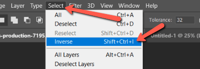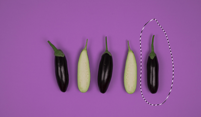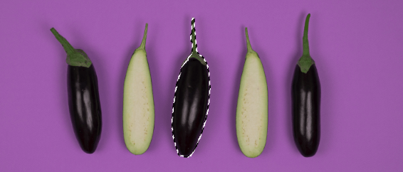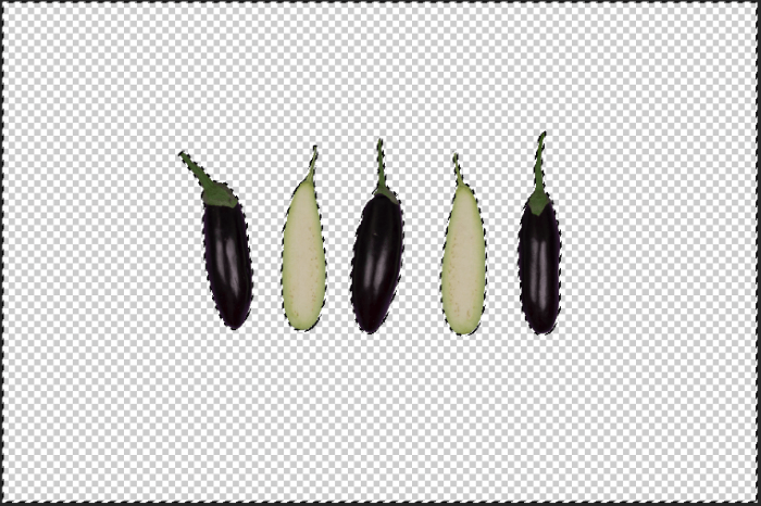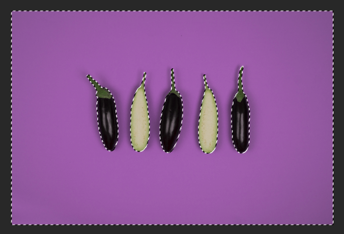Invert the selection so everything except the eggplants is selected. Do this by hitting Control + Shift + I (Command + Shift + I). Or go to Select in the menu bar and choose Inverse