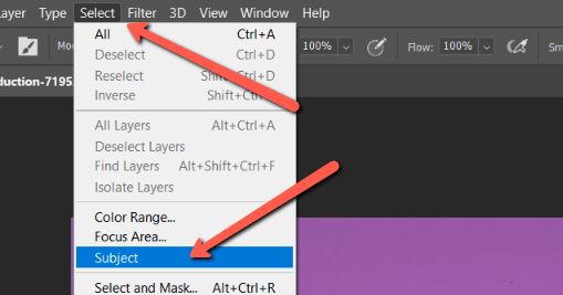 Simply go to Select in the menu bar and choose Subject. Photoshop will do its best to determine what is the subject of the image and make an automatic selection.