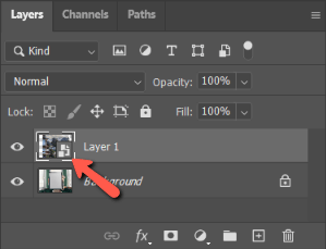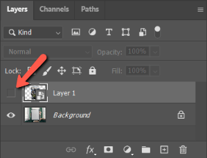 To be able to see what we’re doing, make the top layer invisible by pressing the eye icon to the left of the layer thumbnail.