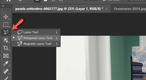 Now, we need to tell Photoshop how we want these two images to fit together. Because this is a rectangle, choose the Polygonal Lasso Tool from the toolbar on the left.