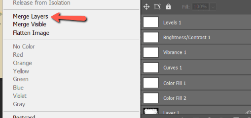 Now right-click on the layers. Select Merge Layers from the menu that appears. Notice that the Flatten Image command is available here as well. Both commands are available in both locations.