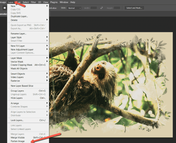 There are a couple of different ways to flatten files in Photoshop. Let’s use the Flatten Image command.