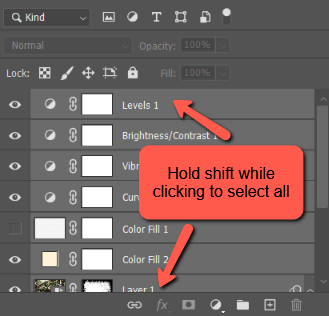 To merge layers, select all the layers by clicking on the first layer, holding the Shift key, and clicking on the last layer.
