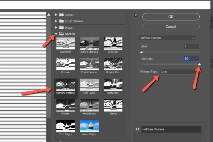 Open the Sketch folder and choose Halftone Pattern. Set the Pattern Type to Line and turn up the Contrast to the max. You can play with the Size if you wish. Click OK when satisfied.