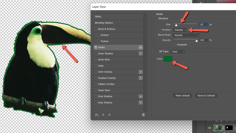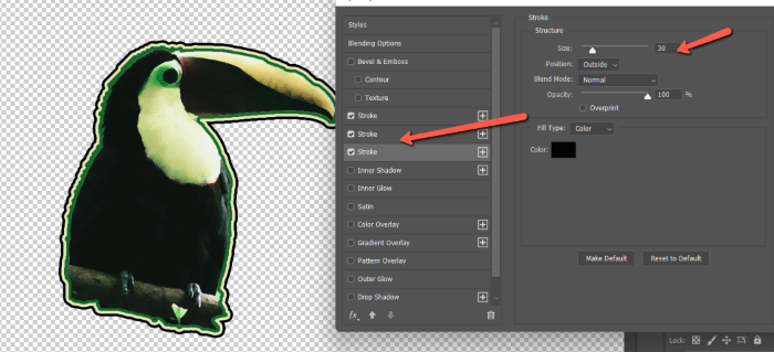 Your new stroke will appear with the same settings, so nothing will change in the image just yet. Change the color and increase the pixel size to make the second stroke thicker and come out from behind the first one.