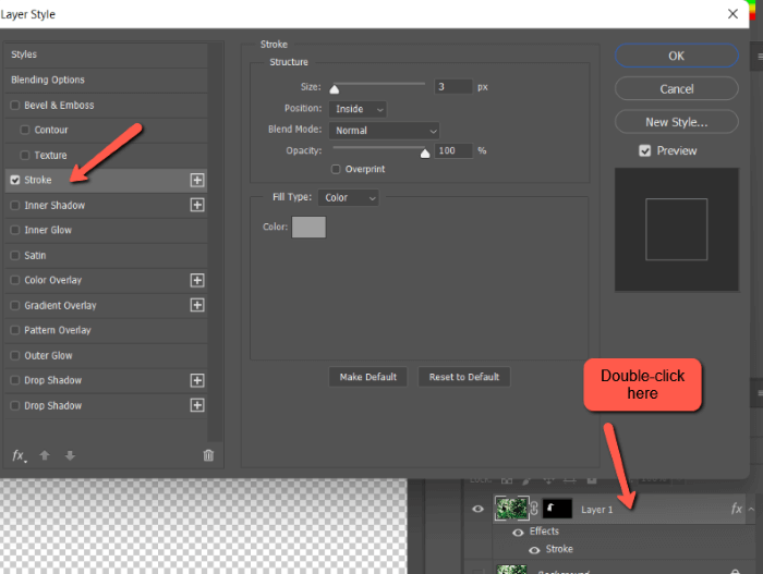 To create the outline, let’s add a stroke layer style. Double-click on the mask layer to open the Layer Styles panel. Click the Stroke option on the left side.