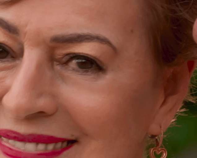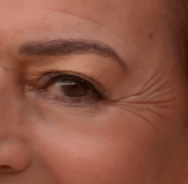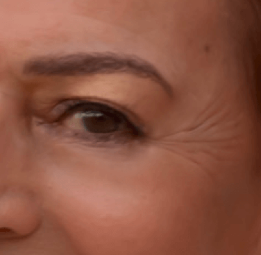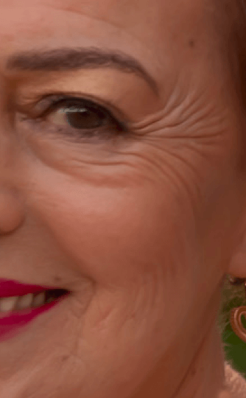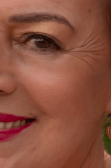Now, if I try to totally erase the crow’s feet around her eyes, it will look odd. Not only is it really difficult to blend it well, but it’s just unnatural for her not to have these wrinkles.