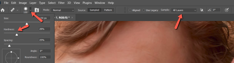 Let’s look at the settings. Click the little arrow next to the brush icon to open the brush settings. For better blending, you’ll want to bring the hardness down. Also, make sure that the Sample box says All Layers or Current and Below.