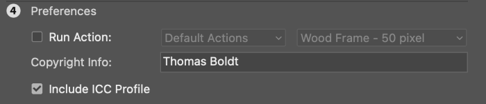 This last step is optional and allows you to add any pre-defined Action that you’ve created before the final resize operation is performed. You can also choose to include copyright info in each image’s metadata, but it’s only a basic text field.