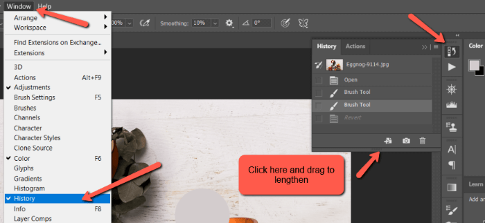 If you don’t see this toolbar, you can find the history panel by clicking on Window in the menu bar. Then go down and select History and the panel will appear.
