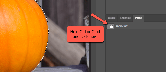 To turn the path into a selection, hold Ctrl or Command and click the thumbnail for your path. You’ll see the marching ants appear around your selection.