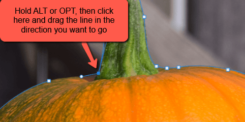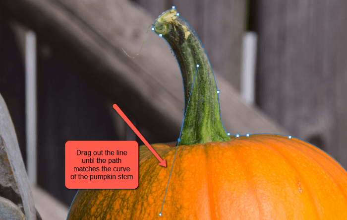 After coming down the pumpkin stem, I have to change angles. If I just drop a point off to the left to continue following the pumpkin, the curve will do all sorts of strange things.